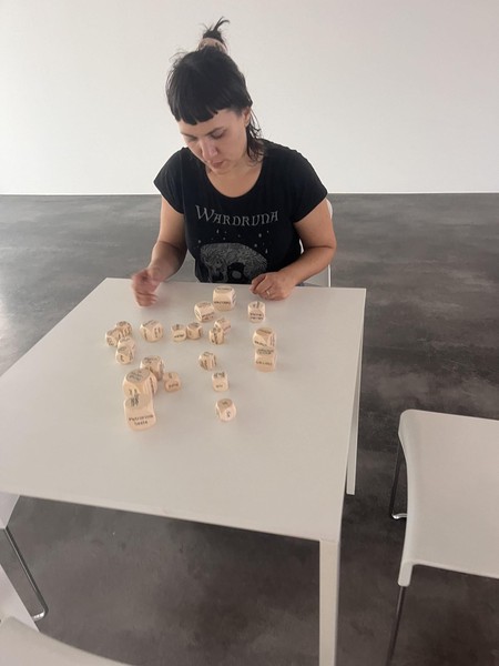 Mascha Kaléko, “The Contribution of Women in Culture” installation with table and chairs / playable.